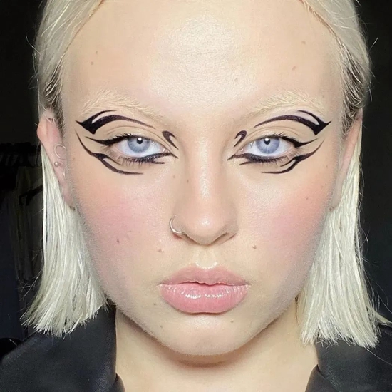 Eyebrow-less modeling completely breaks the limitation of the original eyebrow frame, so the scope of eye shadow can also be expanded to the part on the brow and forehead, showing a more cool sense of the future.